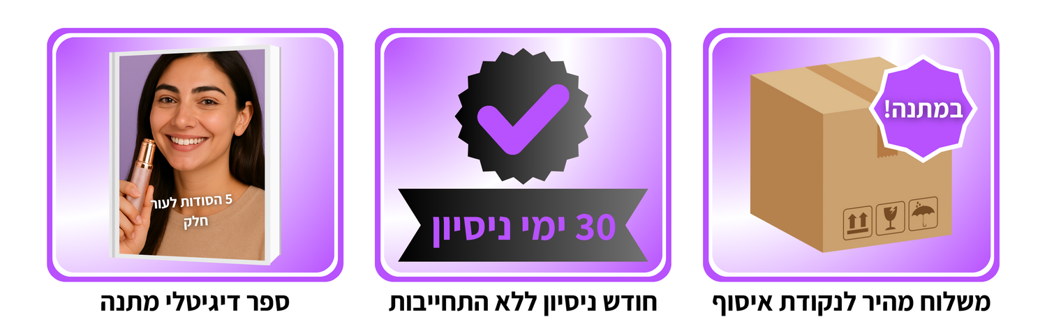שאלה מעולה! אנחנו מביאים חודש ניסיון ללא התחייבות - בחינם לגמרי. ואם לא הייתם מרוצים מהמוצר שלנו מאיזה שהוא סיבה, תוכלו לדבר עם השירות לקוחות המסור שלנו עד חודש מקבלת המוצר לתיאום החזר.